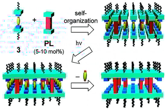 - Kishikawa, K.; Hirai, A.; Kohmoto, S. Fixation of multi-layered structures of liquid crystalline 2:1 complexes of benzoic acid derivatives and dipyridyl compounds and the effect of nanopillars on removal of the dipyridyl molecules from the polymers. Chem. Mater. 2008, 20, 1931–1935. [Google Scholar] [CrossRef]