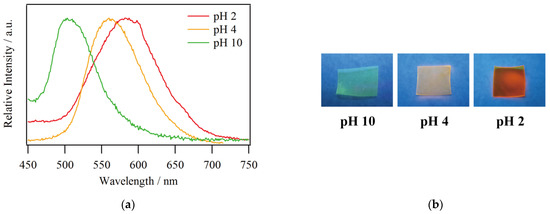 A transparent yellow film was obtained by soaking Na-form Nafion in an acetonitrile solution of compound 1 while ion exchange was enhanced by protons coming from nitric acid. The emission color of 1@Nafion was in close agreement with that of the solution, and the film showed maximum emission wavelengths at 587, 560, and 503 nm at pH 2, 4, and 10, respectively (Figure 4). The emission color change was reversible; the film emitted a greenish light when the as-prepared film was exposed to ammonia vapor and a reddish light after exposing it to nitric acid solution, which was similar to the photographs in Figure 4b. Accordingly, a tunable multicolor-emitting transparent film has been successfully developed. A related reported case is the application of [RuII(bpy)2(dhphen)]@Nafion (bpy = 2,2’-bipyridine, dhphen = 4,7-dihydroxy-1,10-phenanthroline) as a pH sensor [27,28]. The deprotonated dhphen2− works as a π-donor to stabilize the CT-excited state of [RuII(bpy)2(dhphen)], causing a significant red shift of the emission peaks (from 650 to 735 nm) and substantial intensity drop with increasing pH [29]. The [RuII(bpy)2(dhphen)]@Nafion film can serve as a pH sensor over a wide range of pH, from 1 to 8, by monitoring the emission intensity at each change in pH. Regarding the present 1@Nafion, it can be considered to have an advantage in working as a pH sensor which can be recognized with the naked eye, since its emission wavelength varies widely within the visible spectrum in response to a wide range of pH changes.