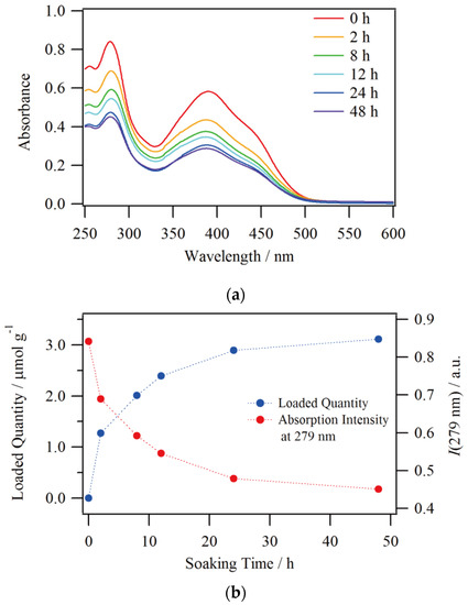 Since Nafion has a greater affinity for the more highly charged ions, tricationic [1·H3]3+ was produced by acidifying the DMSO/H2O solution of compound 1 with nitric acid in order to enhance the ion exchange. In addition, it has been reported that DMSO has a much higher degree of swelling to Nafion than other typical organic solvents such as MeOH and CH3CN, which results in higher ion exchange and transport performances [31,32]. These features enabled us to monitor the ion exchange rate of compound 1 by UV-Vis absorption spectroscopy. The absorption spectra of the solutions with respect to Nafion soaking time are shown in Figure 5a. The initial spectrum has peaks at 279 and 390 nm with a shoulder around 440 nm. This spectral shape is in good agreement with the reported 1·H3 [25]. A relatively large decrease in absorbance was observed at 2 h after starting the soaking, and then the decrease became small, and there was almost no difference in spectral intensity between 24 and 48 h of the soaking time. The calculated quantity of complexes loaded into Nafion according to these absorbance ratios at 279 nm are shown in Figure 5b, and it can be seen that the loaded quantity into the film increased with increasing the soaking time. The loaded quantity almost reached saturation at 24 h, and the final amount of complexes loaded at 48 h was 3.11 μmol per 1 gram of Nafion. Besides, a monoexponential fit on the decreasing process of solution concentration ([1]sol) was performed as follows, which is also shown in Figure S1 in Supplementary Materials.
