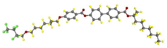 The general structure of (S)-4′-(1-methyloctyloxycarbonyl) biphenyl-4-yl 4-[7-(2,2,3,3,4,4,4-heptafluorobutoxy) heptyl-1-oxy]-benzoate (3F7HPhH7), where C-atoms are marked by dark gray, H-atoms by yellow, O-atoms by red and F-atoms by light green.