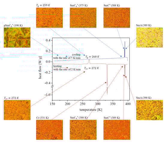 Differential scanning calorimetry (DSC) thermograms as well as the images of polarized light microscopic (POM) textures of 3F7HPhH7 are shown in Figure 2. During cooling, the compound under study transits at 389 K from the isotropic phase to the SmA phase with the characteristic fan-shaped texture, then (at 388 K) it immediately proceeds to the SmC* phase with the broken fan-shaped texture. At 375 K, the transition to the SmCA* phase with the striated fan-shaped texture was visible. At approximately 259 K, the SmCA* phase vitrified. The characteristic signature of glass transition are sharp discontinuities in the heat flow, seen on the DSC thermogram between 250 and 180 K, as well as the appearance of cracks on POM images [], just as it was noticed in References [,]. During heating, the process of a cold crystallization at 272 K was observed. After the transition between crystal phase and the SmCA* phase (at 331 K), the enantiotropic system previously detected during cooling was observed in the reverse order: SmCA*–380 K–SmC*–389 K–SmA–390 K–Iso. It is worth adding that in the vitrification process of the SmCA* phase, the active stochastic movements are frozen. Upon heating, the glass softens and passes to the supercooled SmCA* phase, which then crystallizes. Thus, during the cycle of the vitrification—glass softening—cold crystallization, we do not go back to the starting point. While the vitrification and softening processes involve the same stochastic movements, the same cannot be said of cold crystallization. More information on polymorphism of 3F7HPhH7 is available in Reference [].