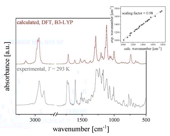Theoretical calculations for an isolated 3F7HPhH7 molecule in energetically most-favorable conformation (Figure 1) were performed in order to interpret measured infrared absorption spectra, as shown in Figure 3. The description of absorption bands with the assigned types of vibrations is contained in Table 1. The calculated spectrum remains in an acceptable agreement with the measured one (including a scaling factor of 0.98) [], except the bands associated with stretching vibrations of C–H bonds (the changes of the position of these bands on both spectra are connected with the anharmonic effects occurring in these vibrations). Other slight differences in the position of absorption bands in the region of stretching vibrations may be due to the fact that the spectrum was calculated for a single molecule of a specific conformation, while the measured spectrum was obtained for the real sample in which molecules can take a variety of conformations, affecting the effective frequencies of bands []. Since such a complex spectrum consists of many overlapping bands, not all vibrations can be further studied in detail. The most significant bands, taken for the analysis and discussed further on, are those in the region of stretching vibrations of carbonyl groups in the chiral center, ν(C=O)chiral_c., and in the rigid core, ν(C=O)core (at 1750–1700 cm−1). These bands are sensitive to various intra- and inter-molecular interactions, and they can be easily analyzed as they are well-separated from other bands [,]. Moreover, also other bands (e.g., in the wavenumber regions of asymmetric ν(C–H)asym and symmetric ν(C–H)sym C–H stretching vibrations, of ρ(C–H) rocking vibrations and of asymmetric ν(C–O–C)asym and symmetric ν(C–O–C)sym C–O–C stretching vibrations) were taken into account.