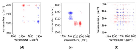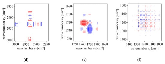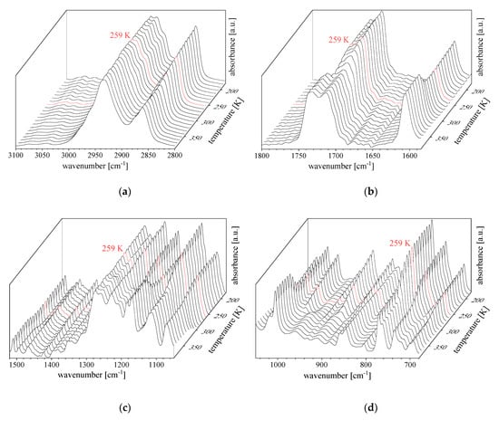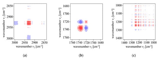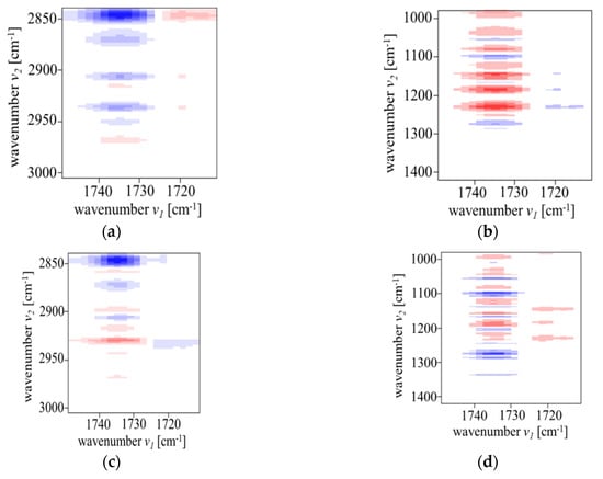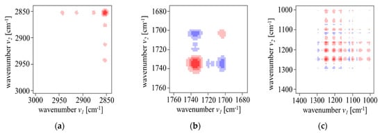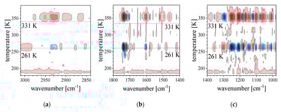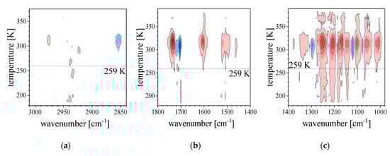 Figure 6 presents the 2D-COS correlation maps, obtained during the cooling in the temperature region from 349 to 259 K in the wavenumber regions of ν(C–H) (at 3100–2800 cm−1) vibrations, in Figure 6a, ν(C=O) (at 1800–1580 cm−1) vibrations, in Figure 6b, and ν(C–O–C) (at 1520–1050 cm−1) vibrations, in Figure 6c. Both synchronous and asynchronous maps are plotted on a plane between two independent wavenumber axes.