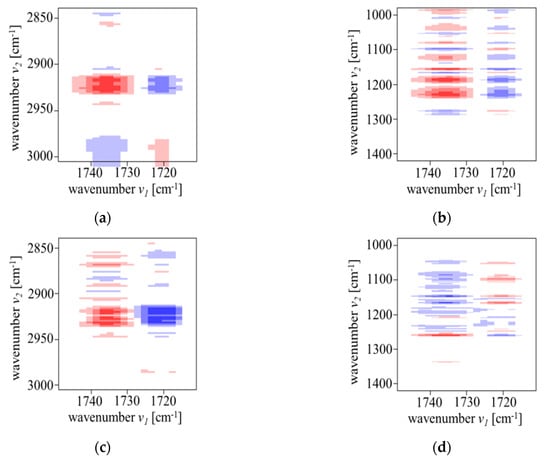 2D-COS correlation (a,b) synchronous and (c,d) asynchronous maps of 3F7HPhH7 in the cooling mode from 349 to 259 K in the wavenumber regions of: (a,c) 1750–1710 cm−1 vs. 3000–2840 cm−1 and (b,d) 1750–1710 cm−1 vs. 1400–1000 cm−1. The red or blue areas represent positive or negative correlation intensities, respectively.