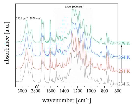 The FTIR spectra changes in the wavenumber regions of ν(C–H) (at 3100–2800 cm−1), ν(C=O) (at 1800–1580 cm−1), ν(C–O–C) (at 1520–1050 cm−1) and ρ(C–H) (at 1050–680 cm−1) vibrations during the cooling process at the rate of 5 K/min from 403 to 173 K are shown in Figure 4. These regions proved sensitive to the structural changes occurring after the vitrification process, but insensitive to the transition between smectic phases.