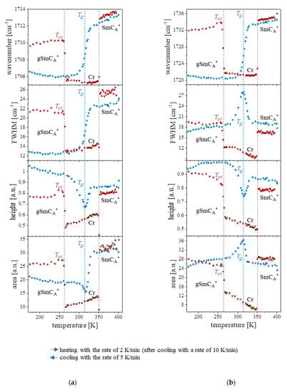 Stretching vibrations of the C=O groups prove an especially sensitive probe of changes to the local surrounding of a molecule, including weak non-covalent interactions, hydrogen bonds, etc. This feature was already made use of above in this work. To continue, also in this case, we turn our attention to the changes of wavenumbers, FWHM’s, areas and heights of ν(C=O)chiral_c. (Figure 13a) and ν(C=O)core (Figure 13b) bands, as a function of temperature. An example of fitting two Lorentz-shaped absorption bands in the carbonyl groups stretching vibrations region was presented in Reference []. During cooling with the rate of 5 K/min, a gradual decrease of wavenumber was seen for both bands in the SmCA* phase. Next, the of both bands exhibited inflection points, and so did FWHM of the ν(C=O)chiral_c. band at the temperature of about 320 K, i.e., at the glass transition. At the same temperature, the extremes were observed for the remaining characteristics, i.e., the area under the ν(C=O)chiral_c. band as well as the height of both bands reach their minima, while the area and FWHM of the (C=O)core band are at their maxima. Then, the values of the ν(C=O)chiral_c. band parameters slowly increase during cooling, while for ν(C=O)core, the opposite is observed (except the wavenumber) in the gSmCA* state. During heating with the rate of 2 K/min (after previous fast cooling with the rate of 10 K/min), a rapid decrease of both band parameters was seen at approximately 260 K, i.e., at temperature of the sample crystallization. This effect is associated with the increase of intermolecular interactions that affect the carbonyl groups vibrations. Next, the ν(C=O)chiral_c. band parameters increase upon heating, while the opposite situation is visible for the ν(C=O)core band parameters in the crystal phase. The observed changes could be explained by the sensitivity of C=O groups to the short-range order of molecules, which is first built up during crystallization process. Then, a rapid increase of both band parameters upon heating at approximately 350 K was noticed, which is associated with the Cr–SmCA* phase transition. This growth may be associated with the movements of C=O groups relative to each other, and thus with change of the sensitivity of carbonyl groups to inter-molecular interactions with temperature.