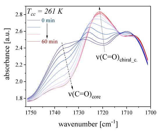 Additionally, we examined the spectral evolution in the carbonyl stretching region during the cold crystallization process at 261 K of 3F7HPhH7, which is shown in Figure 14. The intensity of the ν(C=O)chiral_c. band increases gradually with time at , while that of the ν(C=O)core band decreases. We concluded that, during the cold crystallization, the vibrations related with carbonyl groups behave differently. It seems rational to assign one component (ν(C=O)chiral_c.) as characteristic for the crystal phase, while the other (ν(C=O)core) for the gSmCA* state [].