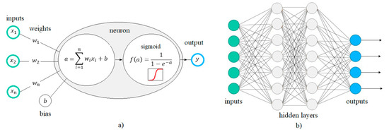 Example of a feed-forward ANN: (a) neuron, (b) architecture.
