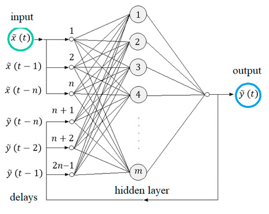 NARX are time-delay recurrent networks suitable for short time lag tasks. They have several hidden layers that relate the current value of the output to: (i) past values of the same variable and (ii) current and past values of the input (exogenous) variables (Figure 3). Such a model can be described algebraically by Equation (4):