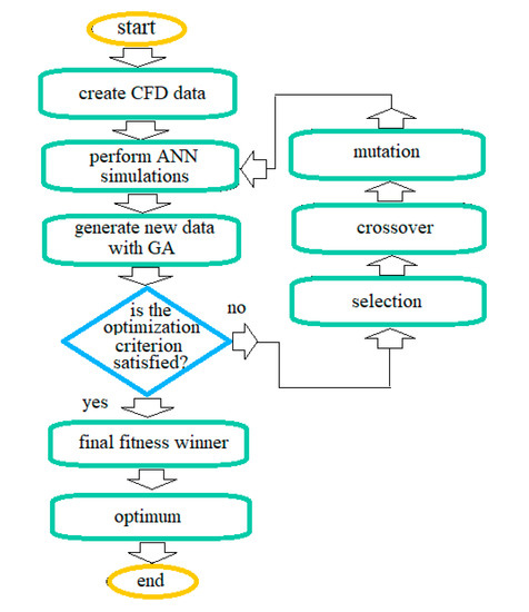 When combining an ANN and a GA, a search for the optimum starts by randomly generating a set of inputs and their corresponding outputs predicted by ANN. Candidate solutions are then selected according to their fit to previously defined criteria; the GA is then used for evolving new solutions to the problem using crossover and mutation. This is repeated until the optimization criteria are fulfilled [20].