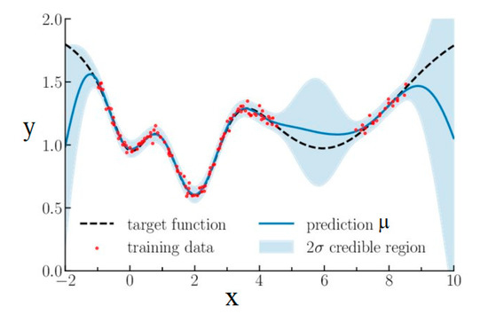 GP is a statistical method capable of modeling the probability distribution of output values for arbitrary sets of inputs simultaneously [21]. A simple example of GP in one dimension is illustrated in Figure 6.