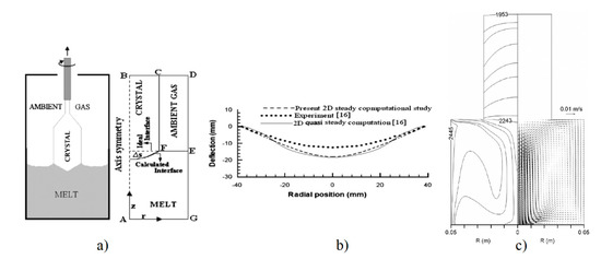 Optimization of the process parameters affecting the shape and position of crystal–melt interface in Cz-YAG crystal growth using feed-forward ANN/GA approach: (a) configuration and computational domain, (b) comparison of literature experimental and CFD predictions of interface deflection for InP with CFD predictions of interface deflection for YAG, (c) optimized temperature and velocity field. Reprinted from [18] with permission from Elsevier.