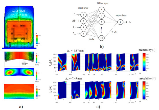 Optimization of magnetic parameters in magnetically driven DS-Si using feed-forward ANN/GP: (a) CFD and magnetic simulation results for generation of database, (b) ANN architecture, (c) probability distribution of fulfilling the condition |Δ| < 0.1 mm as a function of Travelling magnetic field’s (TMF) magnetic parameters. Reprinted from [29] with permission from Elsevier.
