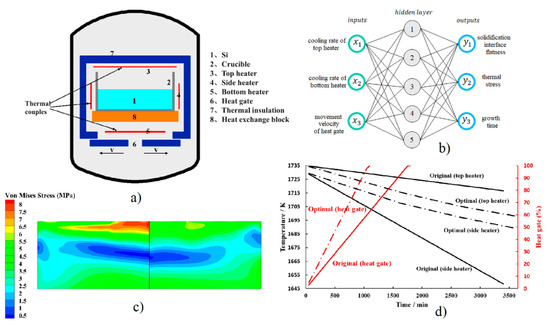 Feasible approach for the ANN applications with inaccurate input values or more than one possible solution is to provide uncertainty information to the ANN predictions by the superposition of ANN with a GP. This combination of two statistical methods was used in [29,30] for a fast prediction and optimization of magnetic parameters for temperature field management, i.e., for flat solid–liquid interface deflection Δ (|Δ| < 0.1 mm), in magnetically driven DS-Si and VGF of GaAs. In [29], 4 inputs (frequency, phase shift, electric current amplitude and crystal growth rate) were correlated with 1 output (solid–liquid interface deflection Δ in magnetic field) using mono layer feed-forward ANN based on 437 CFD axisymmetric quasi steady state simulations, verified with available experimental results (Figure 9). Finally, ANNs were combined with GP models to derive the probability distribution of the output for every given combination of inputs (Figure 9c).