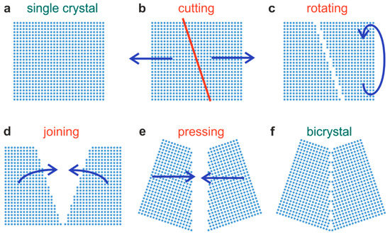 Schematic illustration of the construction of a bicrystal with a Σ5 boundary. A single crystal (a) is cut at an angle of 18.4° (b). Then one part is rotated (c) and joined to the other part (d). Finally, the parts are pressed together (e) at high temperatures to obtain the bicrystal (f).