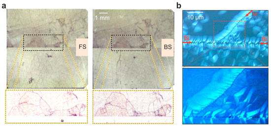 Distribution of dislocations in a “real” 36.8° bicrystal. (a) Optical micrographs of the front side (FS) and backside (BS) after HF etching (the BS image was mirrored for the sake of comparability); (b) Micrographs obtained close to the bicrystal boundary (Bi) with the mosaic structure (M) indicated. The blue coloration of the images results from the optimization of the differential interference contrast. Adapted from Szot et al. [14].
