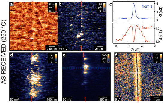 Using LC-AFM, the electrical properties of the as-received bicrystal junctions were investigated as presented in Figure 3. In order to increase the conductivity of the solid oxide by means of thermal activation, the measurements were performed at a temperature of 260 °C under vacuum conditions. As the bicrystals had been epi-polished by the manufacturer, the surface in the vicinity of the junction was atomically flat. Hence, the position of the boundary is hard to identify in the AFM topography map (Figure 3a). However, in the corresponding current map, recorded simultaneously with the topography by means of a voltage of 50 mV (Figure 3b), an irregular arrangement of conducting spots along the junction is present. Well-conducting spots cannot only be seen directly at the junction but also several 100 nm away from the junction. In other regions along the boundary, spots with even higher conductivities have been recorded (Figure 3e). Zooming in on the well-conducting spots (Figure 3d), it can be seen that they consist of smaller spots with diameters in the range of 10–100nm. This could indicate that there is an agglomeration and bundling of conducting filaments formed along of the dislocation network. In some parts of the bicrystal junction, however, the picture was found to be completely different. The map shown in Figure 3f was recorded in a region that did not show any detectable current at a voltage of 50 mV. However, after increasing the voltage to 5 V, a current in the nA range was observed. Directly at the boundary, the current was relatively low, whereas next to the boundary was a broad zone of 500 nm-width with a higher current. Figure 3c shows a comparison of line profiles obtained from the current maps in Figure 3e,f that illustrate the opposing behavior. Whereas, in the latter case, the boundary appears to have an increased but inhomogeneous conductivity, in the other case, the boundary itself appears to be insulating but with a zone of increased conductivity formed beside it. This illustrates that in a “real” bicrystal, a variety of electrically conducting paths can be present, which most likely relate to the imperfections in bicrystal fabrication, as described above.