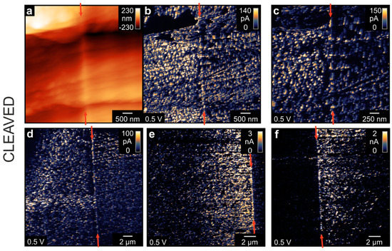 In order to obtain an insight into the conductivity in all dimensions, we investigated the bicrystal after cleaving it perpendicular to the boundary. As SrTiO3 crystallizes in the cubic perovskite structure, it does not possess a defined cleavage plane, resulting in a shell-like fracturing [34]. Hence, the topography map of the cleaved face (Figure 4a) is relatively rough and different facets can be observed. The corresponding current maps at the same position (Figure 4b,c) show an irregular spot-like conductivity pattern typical for cleaved SrTiO3. Although the bicrystal boundary can be readily observed as a line of conducting spots in the center of the image, the current level of these boundary spots was the same as that of spots several 100 nm away from the boundary. This again indicates that a complex filamentary network in the junction zone had evolved. Comparing the topography image with the current map, it can be observed that the distribution of current spots follows the edges and kinks of the facets that had evolved during the cleaving procedure. This could also be an indication for the correlation between dislocations, which tend to agglomerate around edges and conducting filaments. In other parts of the cleavage plane, the distribution of conducting spots showed remarkable differences. In some positions, a relatively uniform distribution of spots on both sides of the boundary could be observed (Figure 4d). Nevertheless, in other positions, there was a distinct difference between the two parts of the bicrystal. In Figure 4e,f, one side of the bicrystal had a significantly lower conductivity than the other part with the boundary being a sharp separation line between the two regions. This could again be related to the fabrication process, whereby two parts of the original SrTiO3 crystal, which might have had a slightly different content of point defects or extended defects, had been joined together to form the bicrystal.