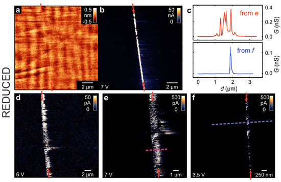 LC-AFM analysis of the 36.8° bicrystal junction after thermal reduction measured at room temperature. (a) Topography with (b) corresponding current map; (d,e) current maps obtained at different positions along the junction; (c) comparison of line profiles extracted from the current maps (e,f).