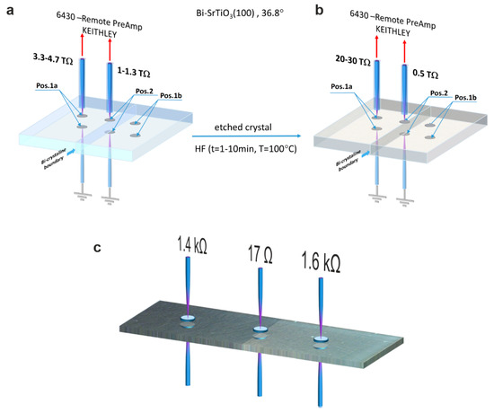 In order to illustrate the significance of the bicrystal boundary on even macroscopic electronic transport, resistance measurements in the out-of-plane geometry were performed, as illustrated in Figure 6. In order to create good electrical contact with the crystal, In electrodes were used. The measurements were conducted at room temperature using direct current (DC) voltages below 1 V. The electrical resistance of the crystal was in the TΩ range, which requires the use of a highly sensitive and sufficiently screened measurement setup. The resistance measured at two positions away from the boundary (position 1a,b) was higher by a factor of 3–4 than that measured exactly at the boundary (position 2), which proves that the enhanced conductivity at the dislocation-rich boundary also has consequences at the macroscale. In a second step, we removed the surface layer by means of HF etching and repeated the measurement of the resistance after depositing fresh In electrodes. Now, the resistance measured away from the boundary was higher than before, while the resistance measured at the boundary was slightly lower (Figure 6b). In the same way, we investigated another bicrystal, which was thermally reduced (Figure 6c). In comparison to the as-received crystal, the resistance had dropped by many orders of magnitude into the kΩ range. A resistance of 17 Ω was measured directly at the boundary, which is lower by a factor of more than 80 compared to the surrounding. This further supports the conclusion that dislocations serve as easy reduction sites, thus providing a template for the formation of highly conducting filaments within the poorly conductive bulk.