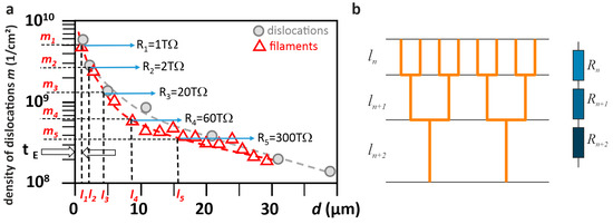 Analysis of the conducting filaments formed along a network of dislocations in SrTiO3. (a) Density of dislocations obtained from TEM investigations by Wang et al. [36] in combination with the density of conducting filaments obtained by an LC-AFM analysis by Szot et al. [14]; (b) Illustration of the model of the hierarchical tree of filaments.