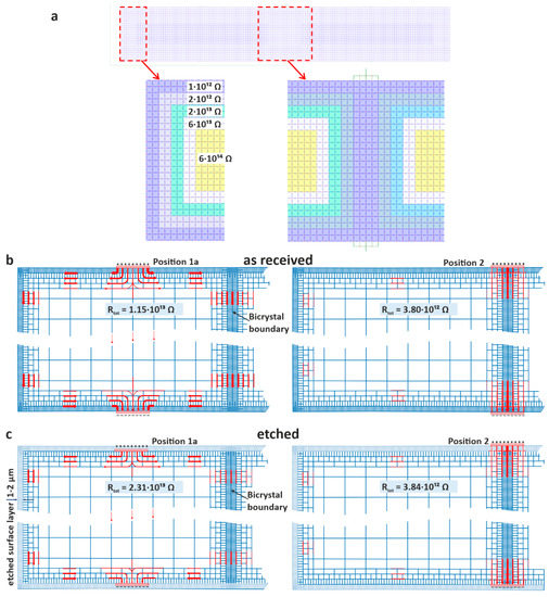 For the simulation of the etched crystal, we removed the topmost layer of resistors, whose thickness corresponds to 1–2 µm. This was justified because we had previously determined the etching rate using an AFM analysis of the etch pits [14]. The rest of the simulation grid remained the same as for the simulation of the as-received crystal. The results in Figure 8c show that the total resistance was increased to 23.1 TΩ in the undistorted region, while the resistance for the electrode configuration directly above the bicrystal boundary was 3.84 TΩ and almost the same as for the as-received crystal.