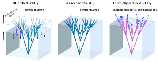 In summary, the electrical circuit simulation shows that the model of a three-dimensional network of dislocations in the shape of a hierarchical tree is plausible and can qualitatively explain the observed conductivity behavior. A graphical illustration of our model is shown in Figure 9. Already in the as-received crystal (center panel), the network of filaments has a higher conductivity than the surrounding SrTiO3 matrix and results in an overall semiconducting behavior. Upon etching (left panel), the surface layer is removed resulting in a lower conductivity, as fewer filaments for transport in the surface layer are available. Additionally, an incorporation of fluorine from hydrofluoric acid into the crystal occurs [41]. During thermal reduction under vacuum conditions (right panel), oxygen is removed from the crystal, typically in the range of 1014–1017O ions/cm3, depending on the conditions (oxygen partial pressure, temperature, time) [14]. Due to the preferential reduction limited to the core of the dislocations, these are transformed into metallic filaments [16]. The local concentration of the oxygen vacancies close to the dislocations is 1020–1021/cm3 and the Mott criterion is locally fulfilled [42,43]. This mechanism is further supported by a rearrangement and bundling of dislocations occurring due to the high-temperature annealing [14]. In consequence, this implies that the formation of conducting filaments can be influenced by the introduction of dislocations e.g., by forming a bicrystal boundary or by mechanical polishing of the surface. This could offer promising opportunities to tune the electrical properties of SrTiO3 by mechanical methods.