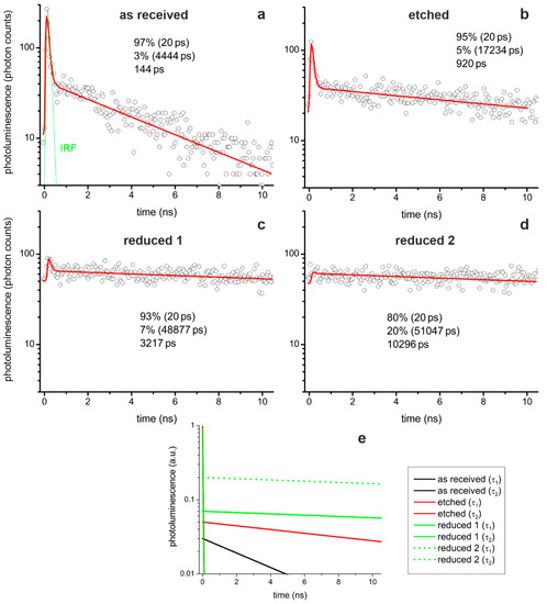 Exemplary photoluminescence decay traces (○) obtained at the SrTiO3 surface away from the bicrystal boundary; as-received (a), HF etched (b), and reduced (c,d). For the reduced crystal, the decays at two different spots are shown, illustrating the variation in the signal. The green line in a) represents the instrument response function (IRF). The biexponential-fit functions convoluted with the IRF are drawn in red. The fit parameters – a1 (τ1), a2 (τ2) – and amplitude-weighted average photoluminescence time, respectively, are given in insets. (e) Visualization of the two fitted exponential functions.