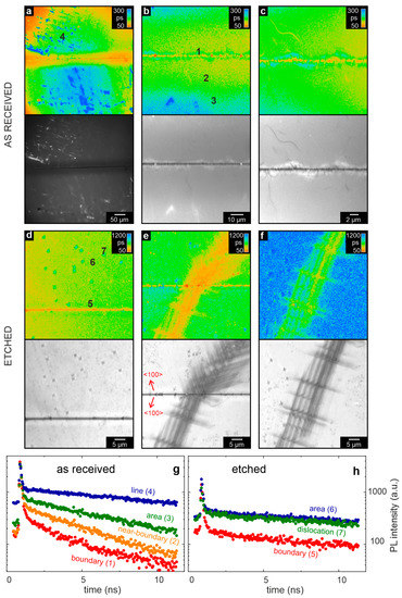 In the following, we focus on an investigation of the photoluminescent properties of the bicrystal, as observed initially in the as-received state. From each measurement region, the photoluminescence lifetime and intensity maps are depicted in Figure 11a–c, together with the decay traces of selected spots in Figure 11g. In the photoluminescence maps, the bicrystal junction can clearly be identified as a narrow, straight region of lower photoluminescence intensity. Along the boundary, an arrangement of spots can be observed that has a shorter lifetime than the surrounding. Those spots were occasionally embedded in structures with a meander-like shape and longer lifetime. An explanation for these observations could be that the mobility of the charge carriers along the dislocations is enhanced. Hence, the excited carriers can be effectively transported to recombination centers, resulting in shorter exciton lifetimes.