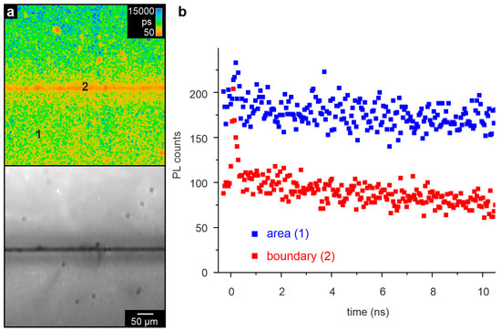 It is also known that with the thermally induced reduction of SrTiO3, the surface region becomes Ti-rich and eventually, titanium suboxides form [54,55]. Hence, the incipient phase transformation could lead to clustering effects on the nanoscale, resulting in the observed inhomogeneous photoluminescence lifetime distribution. Regarding the decay curves shown for two selected spots at the boundary and surrounding surface (Figure 12b), it can be seen that the fast component at the boundary had a much higher amplitude than in the surrounding surface. In consequence, the amplitude-weighted average lifetime at the boundary was also much shorter than in the surrounding surface.