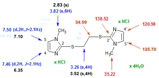 3.2. Synthesis of 1,2-Bis[(1-methyl-1H-imidazole-2-yl)thio]ethane Dihydrochloride Tetrahydrate (2b)