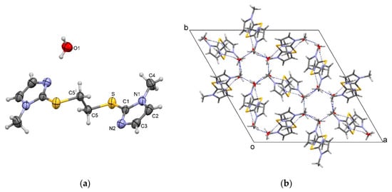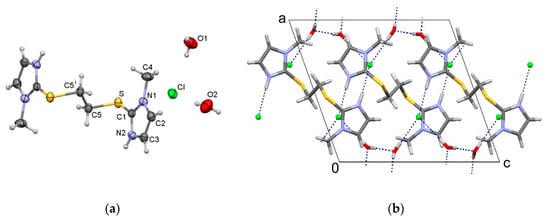 The molecular structure of 2b consisted of two cationic imidazolyl groups bounded to the S-atoms of the dithioethyl group (Figure 2a). Each chloride anion was a hydrogen bond acceptor from the protonated imidazole nitrogen atom N2 and two water molecules (Figure 2b, Table 1). The two water molecules were also connected by hydrogen bonds. Through these hydrogen bonds, the cations, chloride anions and water molecules were interconnected into a 3D network.