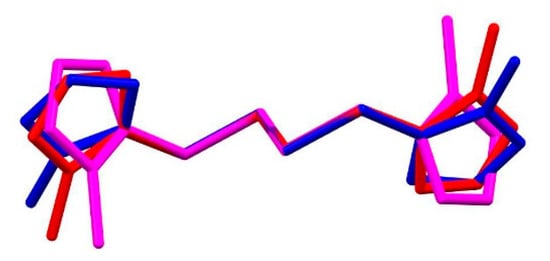 Molecule overlay of 2a (blue), 2b (magenta) and 2c (red). Atoms C5 and S and their pairs related by the inversion centre were used for the overlay. Hydrogen atoms are omitted for clarity.