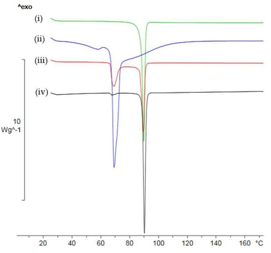 DSC measurement of the selected samples showed, after 30 min, endothermic events belonging to the melting of 2c and 2a, indicating the coexistence of both forms in the sample (Figure 6, iii), and finally, after 60 min, only a single endothermic event at 90 °C, belonging to the melting of the anhydrous form 2a (Figure 6, iv). Unfortunately, no sign of recrystallization was detected.