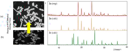 Photomicrographs of: (a) anhydrous 2a after drying of 2c during 60 min at 55 °C /200mbar; (b) starting dihydrate 2c and the related PXRD patterns.