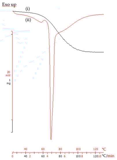 The TGA thermogram of 2c showed a single thermal event in the range 40–110 °C with a mass loss of 11.31%, corresponding to the loss of two water molecules. This was in agreement with the DSC thermogram showing only a sharp endothermic event with an onset at 65 °C, corresponding to the melting of 2c. Additional exothermic processes of recrystallization and endothermic of melting were not detected (Figure 8).