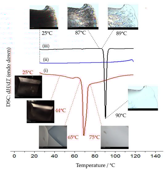 Selected DSC thermograms and HSM micrographs of dihydrate 2c, recorded using a heating/cooling rate of 10 °C/min with perforated DSC crucibles: (i) dihydrate 2c heating step up to 120 °C; (ii) cooling step to room temperature, and (iii) heating step of the recrystallized anhydrous form 2a, i.e., re-run (re-heating) of the sample in the bottom thermogram.