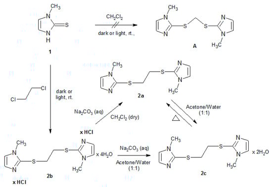 Among the bridged bis(methimazole) compounds, 1,2-bis[(1-methyl-1H-imidazole-2-yl)thio]methane (A) and an analogous ethane derivative 1,2-bis[(1-methyl-1H-imidazole-2-yl)thio]ethane (2a) were synthesized from 1 and dichloromethane or 1,2-dibromoethane. Synthesis was performed in the presence of a strong base, without or under phase-transfer conditions at an elevated temperature [4,5]. In the context of the pharmaceutical purity profile, these compounds are considered as potential methimazole related substances [6], especially if common solvents, e.g., dichloromethane (DCM) and 1,2-dichloroethane (DCE), are used in the synthetic transformations, isolation, purification and methimazole analytics.