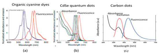 Optical absorption and FL spectra of organic dyes, quantum dots, and carbon dots. (a) Absorption (lines) and FL emission (symbols) spectra of representatives of organic dyes Cy3 (blue) and Cy5 (red) characterized by a resonant spectrum of both absorbance and FL; (b) Absorption (lines) and FL (symbols) of CdSe quantum dots, absorbance spectra, and FL red shift is observed for QDs with the larger size in the range of (3.5–6.0) nm; (c) schematic UV–visible and FL spectra of carbon dots. (Taken from [,]).