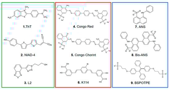 Traditionally, the most important and most widely used fluorescent organic dyes are Thioflavin T (ThT), Congo Red (CR), and 1-Anilino-8-naphthalene sulfonic acid (ANS). ThT (Figure 3, ThT) was first used with a synthetic mimicking the Aβ peptide by Levine in 1993 []. ThT is a fluorescent cationic benzothiazole dye that binds itself to the structure channels on the surface of aggregates in a stabilized fashion. This phenomenon greatly enhances and shifts the fluorescence emission from 445 to 482 nm as a consequence of the loss of rotational freedom in the dye structure. ThT has been efficiently applied to study the kinetic behavior of Aβ polypeptides [] or for the recognition of β-sheet organization in peptide-based materials [] and hydrogels [].