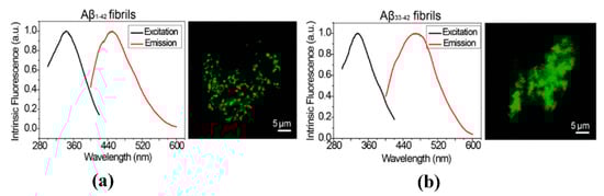 Protein fibrils display fluorescence properties. (a) Excitation and emission spectra of the intrinsic FL in aromatic Aβ1−42 fibrils and corresponding FL image of unlabeled aggregates obtained using a confocal microscope. (b) Excitation and FL emission spectra of the intrinsic FL in non-aromatic Aβ33−42 fibrils and corresponding FL image. (Taken from []).