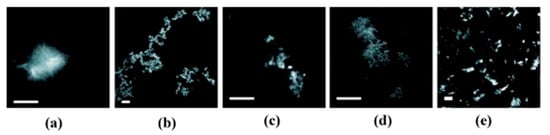 Experimental results obtained in a wide research from five different amyloid systems [] Aβ40 (a), Aβ42 (b), Aβ33–42 (c), K18 tau (d) and I59T lysozyme (e) also showed that this universal FL is observed in all the β-sheet amyloid structures. Fluorescence microscopy images of these different amyloid fibrils emitting FL light in the deep blue wavelength range of ~488 nm are presented in Figure 5.