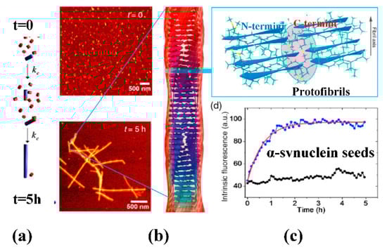 Intrinsic FL displays kinetics of α-synuclein amyloid fibrils growth using a super high-resolution fluorescence microscopy tool. The FL measurements were performed with a diode laser emitting near 405 nm and signals were detected around 450 nm. Short fibrillar seeds of α-synuclein, schematically shown in blue, serve as the template from which fibril elongation proceeds through the addition of monomers, shown in red (a). The top panel to the right demonstrates atomic force microscopy (AFM) images of short fibril seeds at the start of the reaction, at t = 0. Below is an image of the same sample at t = 5 h. Clearly, the elongation of the seeds into long amyloid fibrils has taken place. The structural model (b) of amyloid fibril shows that it consists of many ultrathin intertwined protofibrils. Zoomed-in region (c) indicated in (b) that exhibits the atomic arrangement between adjacent N- and C-termini from these intertwined protofibrils. The applied FL microscopy technique allowed to observe the growth process of amyloid fibrils by recording in time intrinsic FL from the amyloid fibril (d). The blue points correspond to the elongation of α-synuclein seeds in the presence of α-synuclein monomer. The black points correspond to the addition of β-synuclein monomers to the α-synuclein seed fibrils and confirm that the two species cannot “cross-seed” aggregation. (Taken from []).