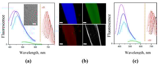 Additional information on the FL phenomenon was assessed by a comparative study between amyloid fibrils grown from thirteen different proteins of both diseased- and non-diseased origin []. The FL spectra unexpectedly revealed two optical regions: a) FL in the visible range with the maximum at 430–450 nm (blue luminescence) under excitation 350–370 nm and b) near-infrared (NIR) FL emission 670–820 nm under excitation 620–780 nm (Figure 7). The blue FL enabled to examine and visualize amyloid aggregates and fibers in vitro without any staining technology. The results obtained for the visible region are completely consistent with all previously published data on FL in amyloid proteins of different compositions [,,,,] and confirm the universality of this FL effect. The notable enhancement of FL intensity in fiber formation and the growing of amyloid fibers gave valuable information about amyloidosis kinetics.