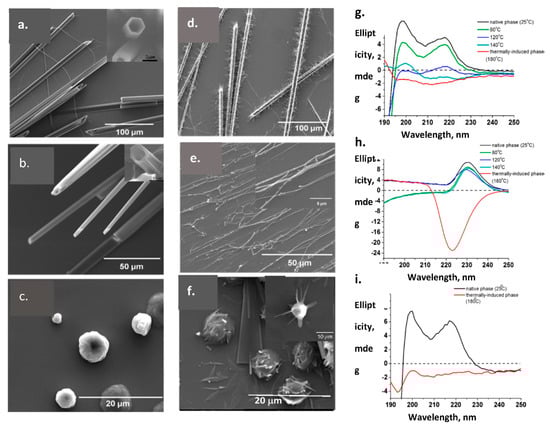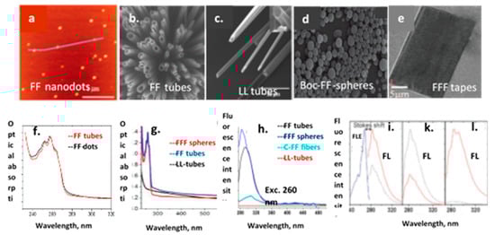 1. The native FF, LL tubular, FFF spherical and FFF tape samples were heat treated in the oven using a step by step procedure from room temperature to 180 °C (at every temperature step the peptides structures were heated for 1 h) and then cooled back to room temperature to study their properties. The thermal treatment led to a deep modification of the native morphology, giving similar elongated close- and open-end fibrillary structures of 10–100 nm in diameter and 100 nm-30μm in length [].