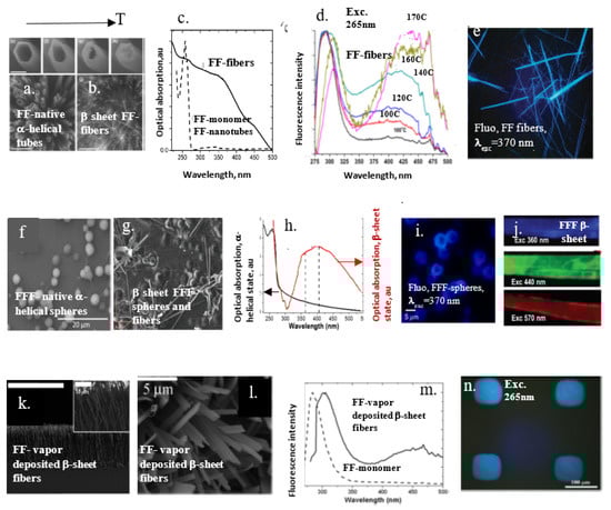 Recently, the family of label-free natural fluorescent bionanomaterials has obtained an additional representative, emerged after an unexpected observation of strong broadband FL emission both in natural amyloid fibrils related to neurodegenerative diseases (Alzheimer’s, Parkinson’s and more) [], and bioinspired synthetic ultrashort di- and tri-peptides fiber structures []. Despite a deep difference in their composition and origin, both amyloid and amyloidogenic fibrillary structures are self-assembled into the same β-sheet architecture and exhibit similar excitation and FL photon emission spectra, making this new FL effect fold-sensitive.