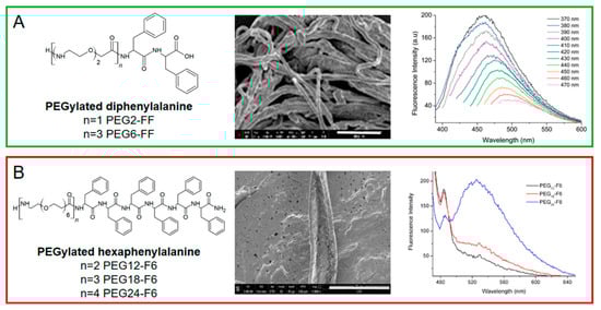 - Diaferia, C.; Roviello, V.; Morelli, G.; Accardo, A. Self-assembly of PEGylated diphenylalanines into photoluminescent fibrillary aggregates. ChemPhysChem 2019, 20, 2774–2782. [Google Scholar] [CrossRef]