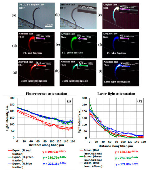 - Apter, B.; Fainberg, B.; Handelman, A.; Lapsker, I.; Accardo, A.; Diaferia, C.; Morelli, G.; Rosenman, G. Fluorescence waveguiding in amyloidogenic fibers. Proc. SPIE 2020, 11360, 113600D. [Google Scholar] [CrossRef]