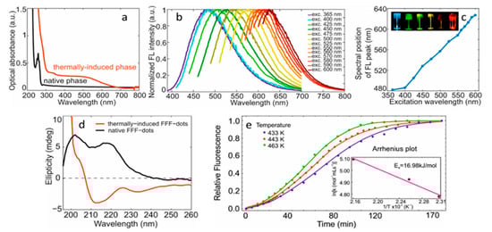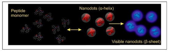 bioimaging; fluorescence labels; fluorescent dyes for imaging of amyloid fibrils; peptide-based materials; PEGylated peptides; peptide nanostructures; peptide aggregates; thermally induced refolding helix-like→β-sheet and intrinsic visible fluorescence in amyloid and amyloidogenic β-sheet nanostructures; fluorescence in polymer/peptide thin films and fibers; reabsorption mechanism of fluorescence long-range propagation; visible fluorescent bionanodots 1. Introduction