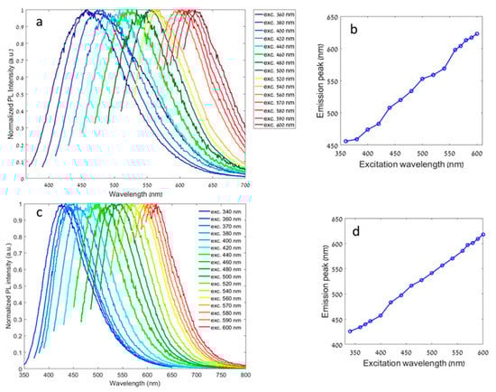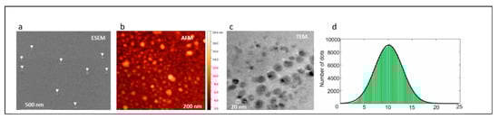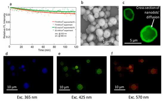 The dimensions of the confined structural regions are defined by a critical quantum size, the exciton Bohr radius. Conceptually, it represents the average distance between the photoexcited electron–hole pair, which is called an exciton. Under the condition in which the physical size of QDs approaches that of the exciton (for example, for CdSe exciton, the radius is about 6 nm) the energy gap of the semiconductor material increases with decreasing size and discrete energy levels arise at the band edges. This means that the optical energy gap of nanoparticles and, consequently, the FL spectra of the QDs can be altered by adjusting their size [], leading to a wide range of FL tunability (Table 1, Figure 1b and Figure 2).